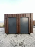 Solução sanitária completa e portátil, com: ✔ Duche + WC independentes ✔ Isolamento térmico (painéis PIR 100 mm) ✔ Sistema de drenagem elétrico ✔ Iluminação exterior ✔ Design moderno (revestimento em madeira nogal)