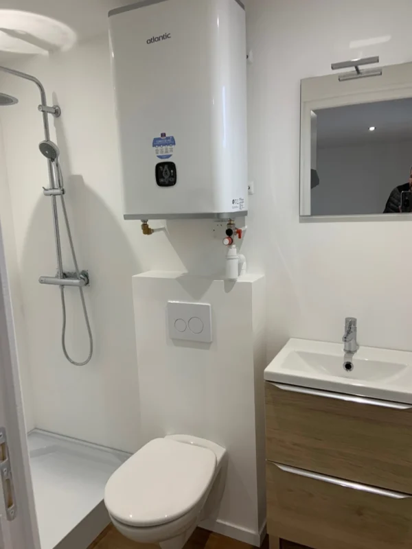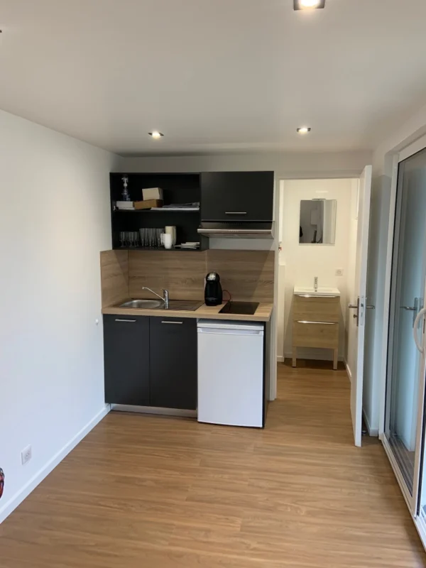 Contentor marítimo de 20 pés transformado e convertido em estúdio. Sala de 10,3 m² equipada com kitchenette. Casa de banho com duche, WC e toucador. Uma grande janela de sacada e uma pequena janela. O isolamento está em conformidade com a norma RE2020. Revestimento horizontal em madeira.