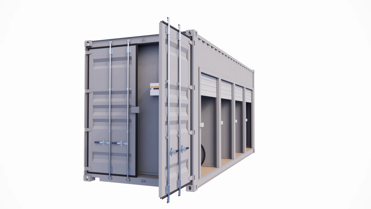Garagem metálica pré-fabricada em contentor de primeira viagem convertido High Cube. Equipada com 4 portas de enrolar em aço galvanizado. Superfície de aproximadamente 3,2 m² por garagem para motociclos. Iluminação em cada caixa. Repintado na cor da sua preferência.